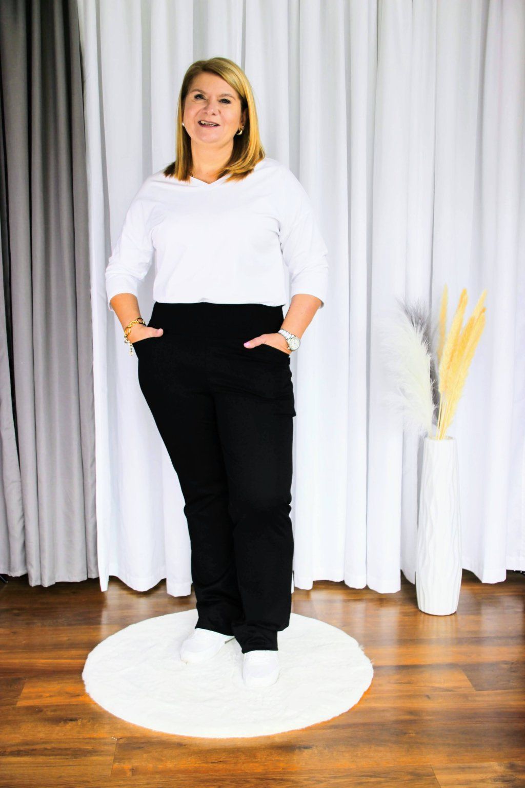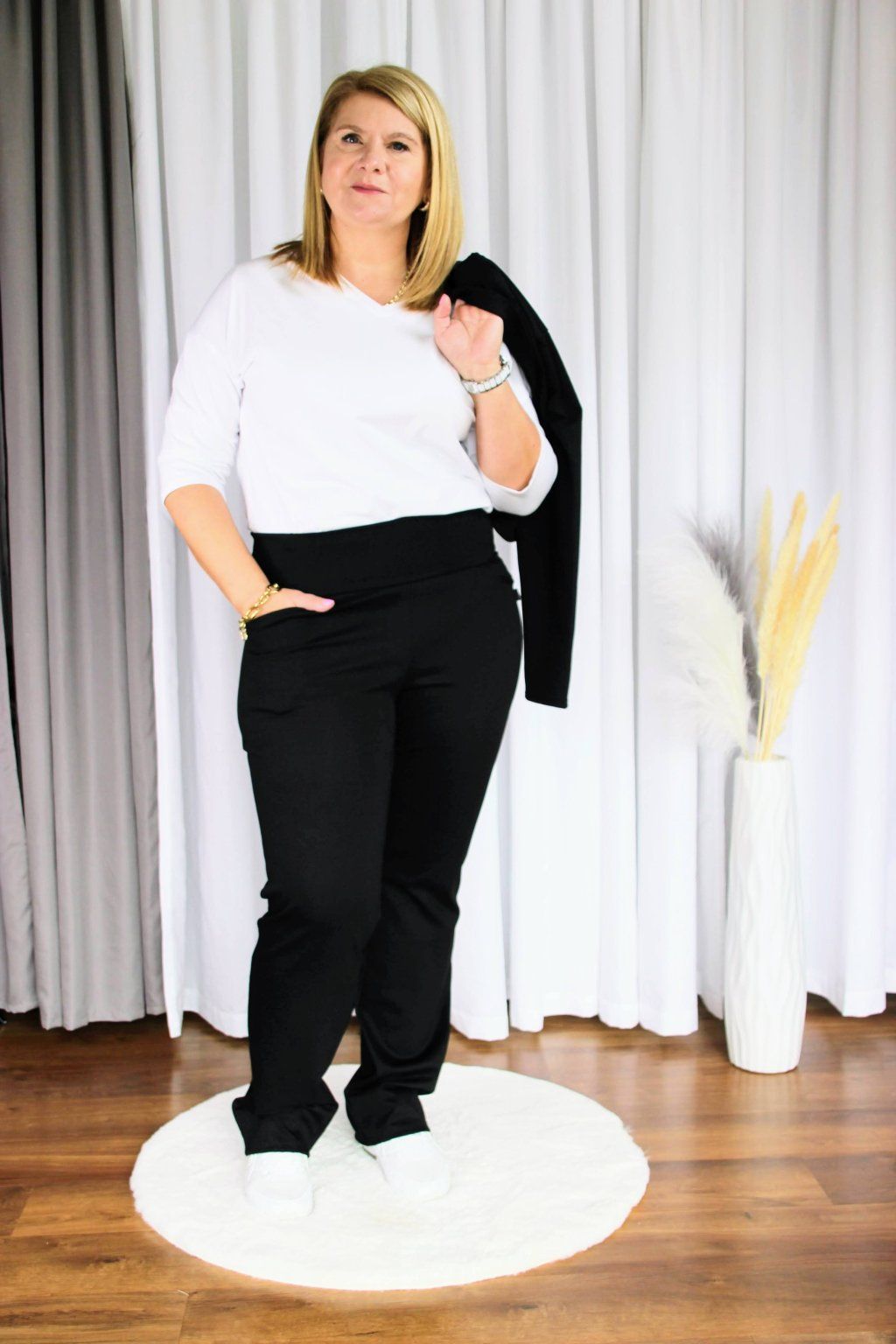 Látka je příjemně pružná, nemačkavá a přizpůsobí se Ti při celodenním nošení, ať už sedíš u počítače, nebo běháš z porady na poradu. Střih je nadčasový, takže snadno zapadne do Tvého šatníku a skvěle se kombinuje.
