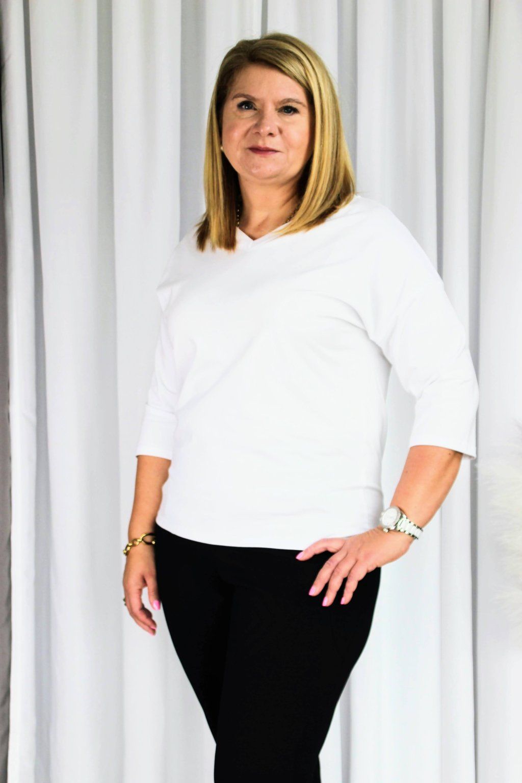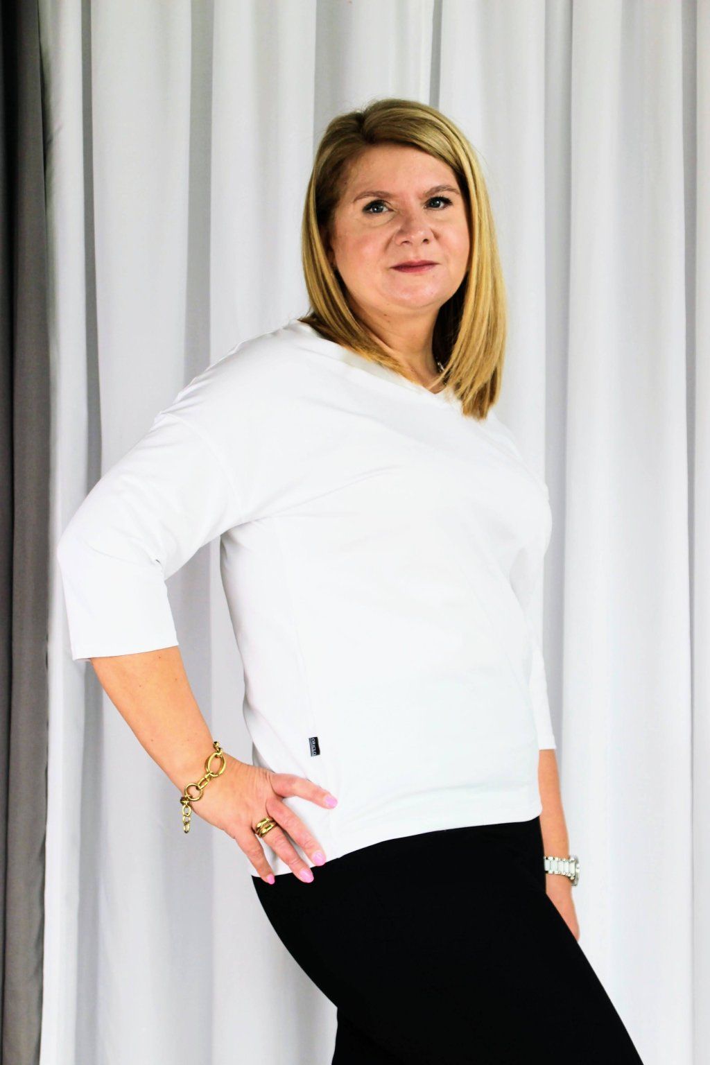 Tričko Elegán jsem navrhla jako ideální náhradu nepohodlné halenky do práce — abys vypadala upraveně, ale cítila se celý den jako v bavlnce. Díky 3/4 rukávu a véčkovému výstřihu působí elegantně a žensky, zároveň ale neomezuje v pohybu.