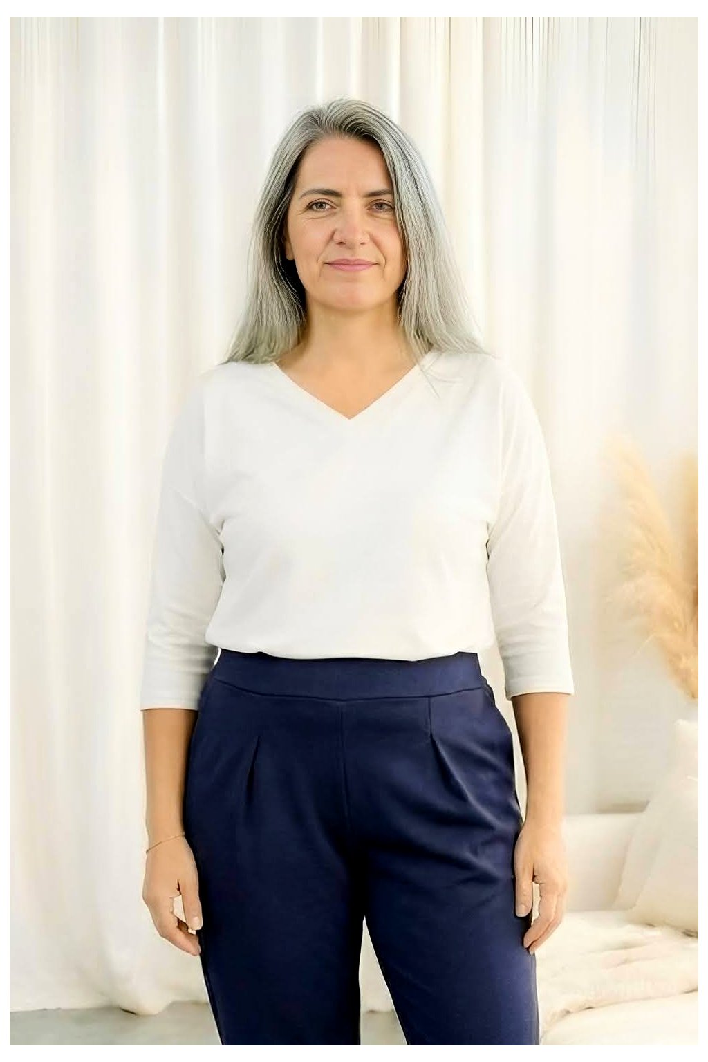 Tričko Ameline jsem navrhla jako ideální náhradu nepohodlné halenky do práce — abys vypadala upraveně, ale cítila se celý den jako v bavlnce. Díky 3/4 rukávu a véčkovému výstřihu působí elegantně a žensky, zároveň ale neomezuje v pohybu.