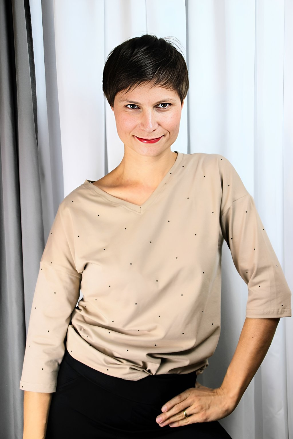 Tričko Ameline jsem navrhla jako ideální náhradu nepohodlné halenky do práce — abys vypadala upraveně, ale cítila se celý den jako v bavlnce. Díky 3/4 rukávu a véčkovému výstřihu působí elegantně a žensky, zároveň ale neomezuje v pohybu.