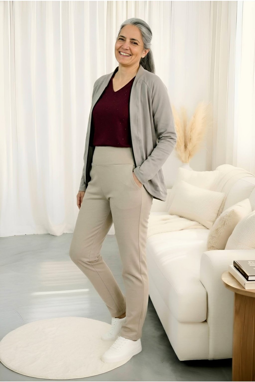 Materiál, který chápe tělo. Když jsem dřív šla mezi lidi, často jsem musela vydržet v tuhých, nepoddajných kouscích, kde se člověk ani pořádně nenadechne. Teď už nemusím. Lume se hýbe se mnou, netlačí, a přitom pořád vypadá elegantně a upraveně.