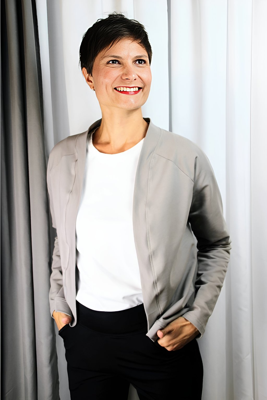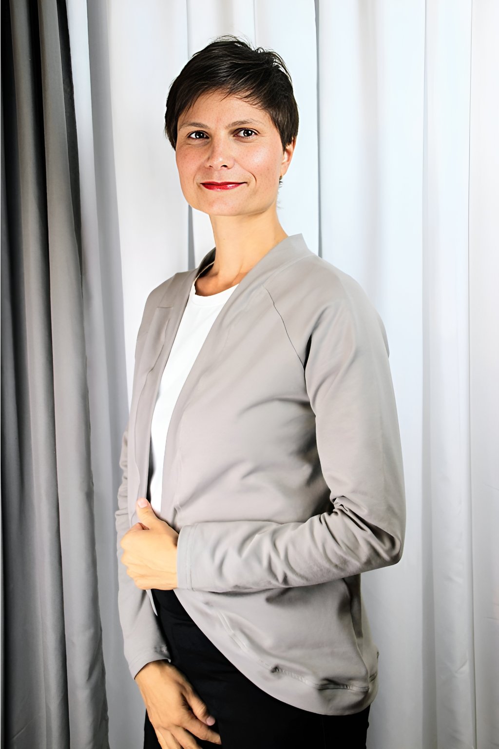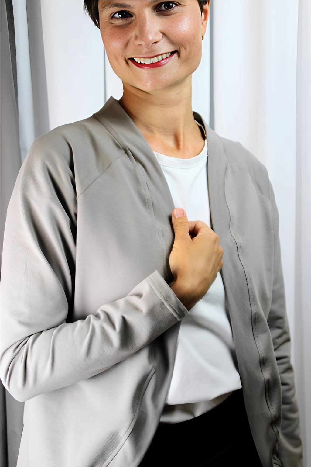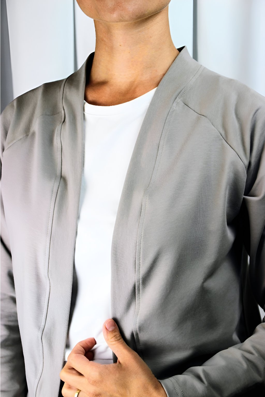 Sakokardigan Lume jsem navrhla jako ideální kousek mezi sakem a kardiganem — když chceš vypadat upraveně, ale necítit se sevřeně jako v klasickém saku. Vypadá elegantně, ale je měkký, pružný a příjemný na nošení, takže si ho zamiluješ do práce i na běžné dny.