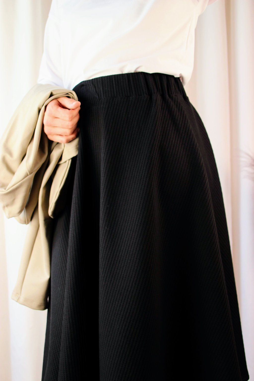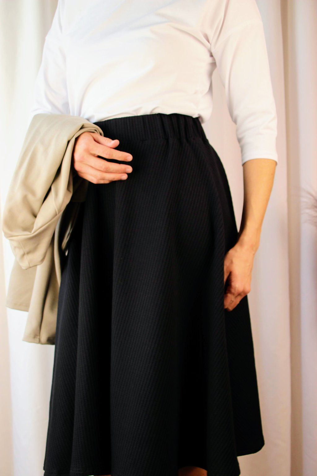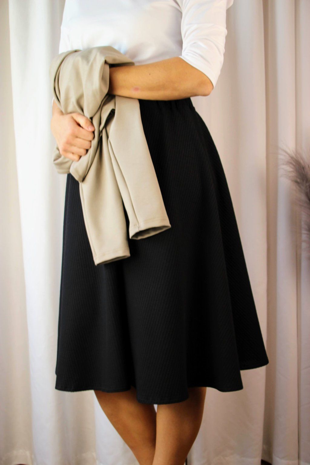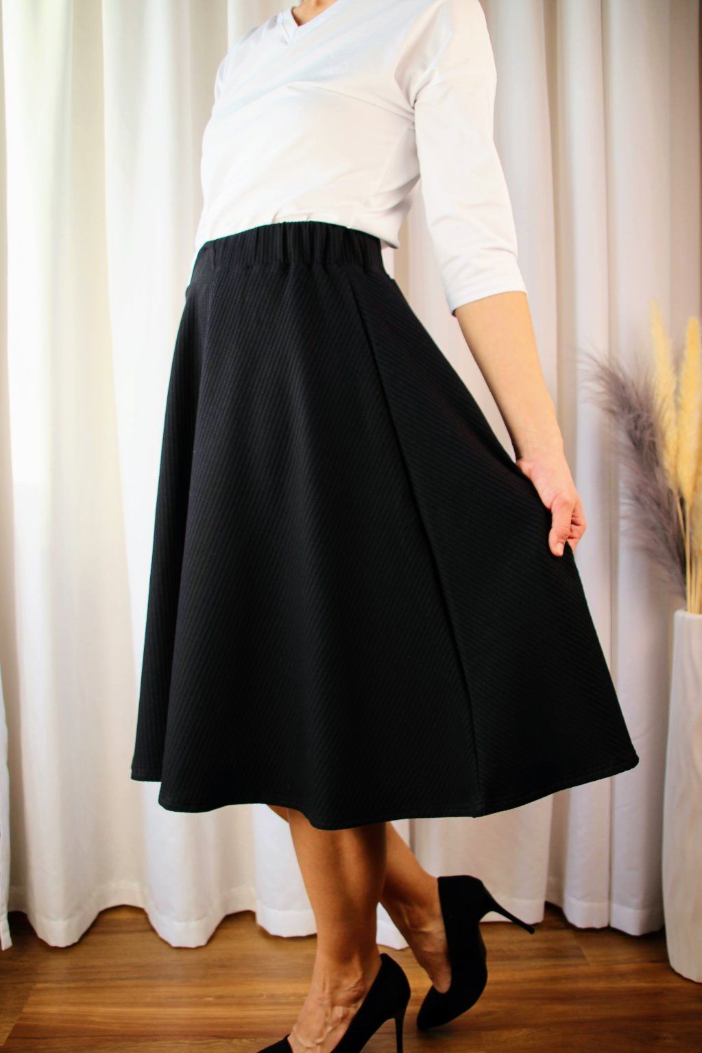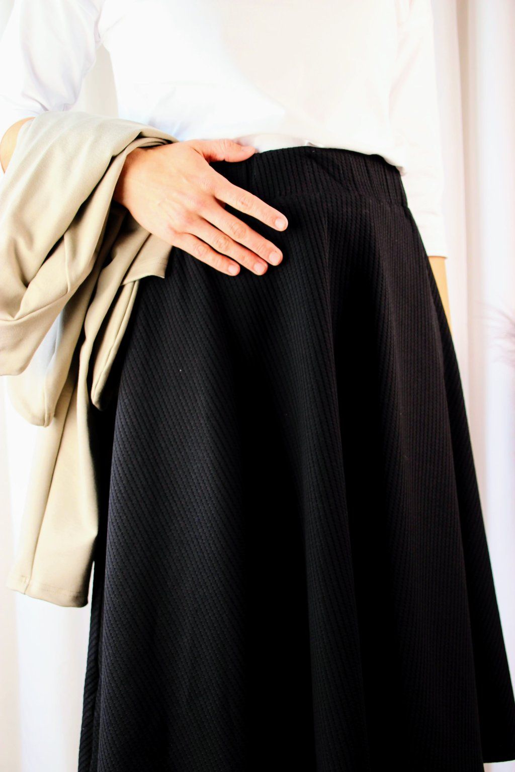 Po důkladném testování různých materiálů našla ideální vaflovou bavlnu, která je jemná, pružná a stále vypadá elegantně. Zároveň miluje midi délky, takže tady to pro ni byla jasná volba✨