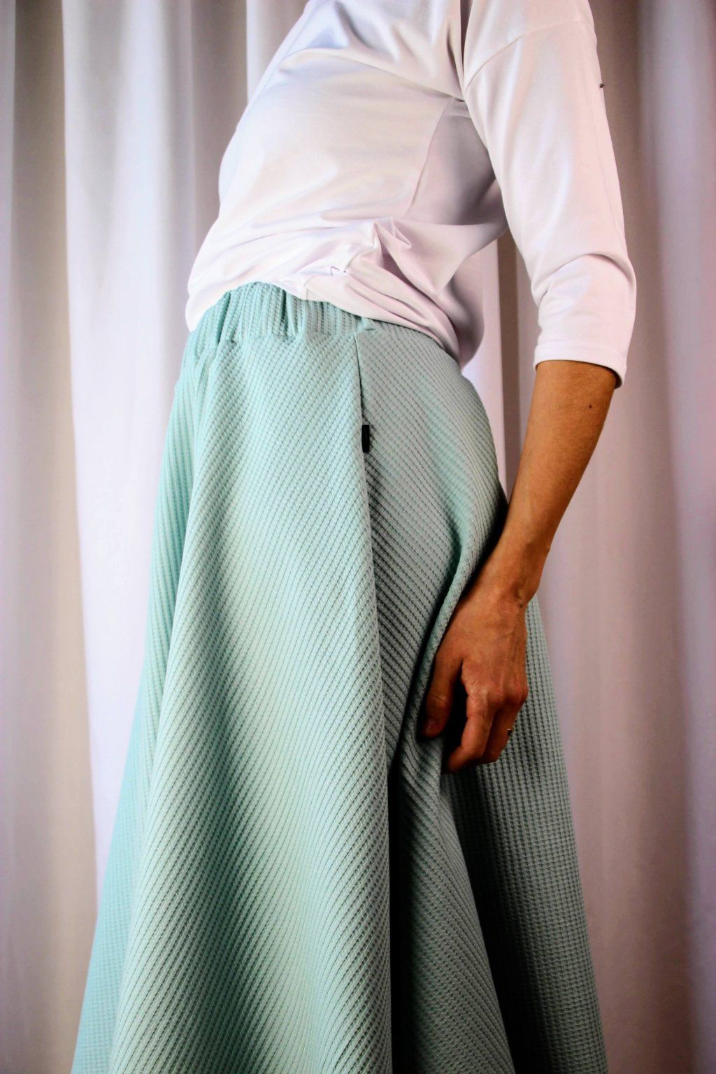Po důkladném testování různých materiálů našla ideální vaflovou bavlnu, která je jemná, pružná a stále vypadá elegantně. Zároveň miluje midi délky, takže tady to pro ni byla jasná volba✨