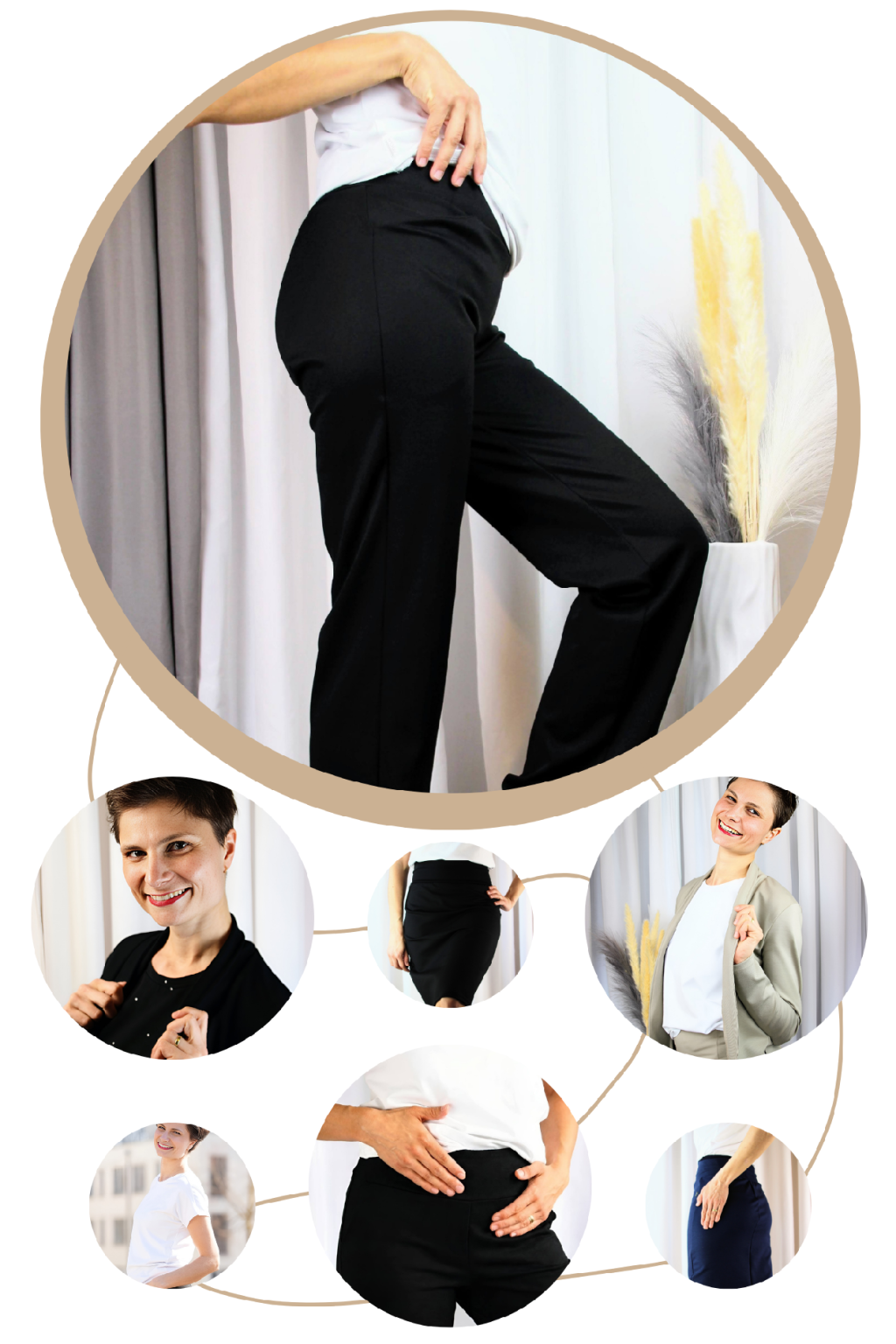 Kancelářky mají široký pohodlný pas, který netlačí a dává bříšku prostor. Díky tomu se v nich nejen cítíte dobře, ale je to i zdravější než klasické těsné kalhoty, které stahují a omezují.