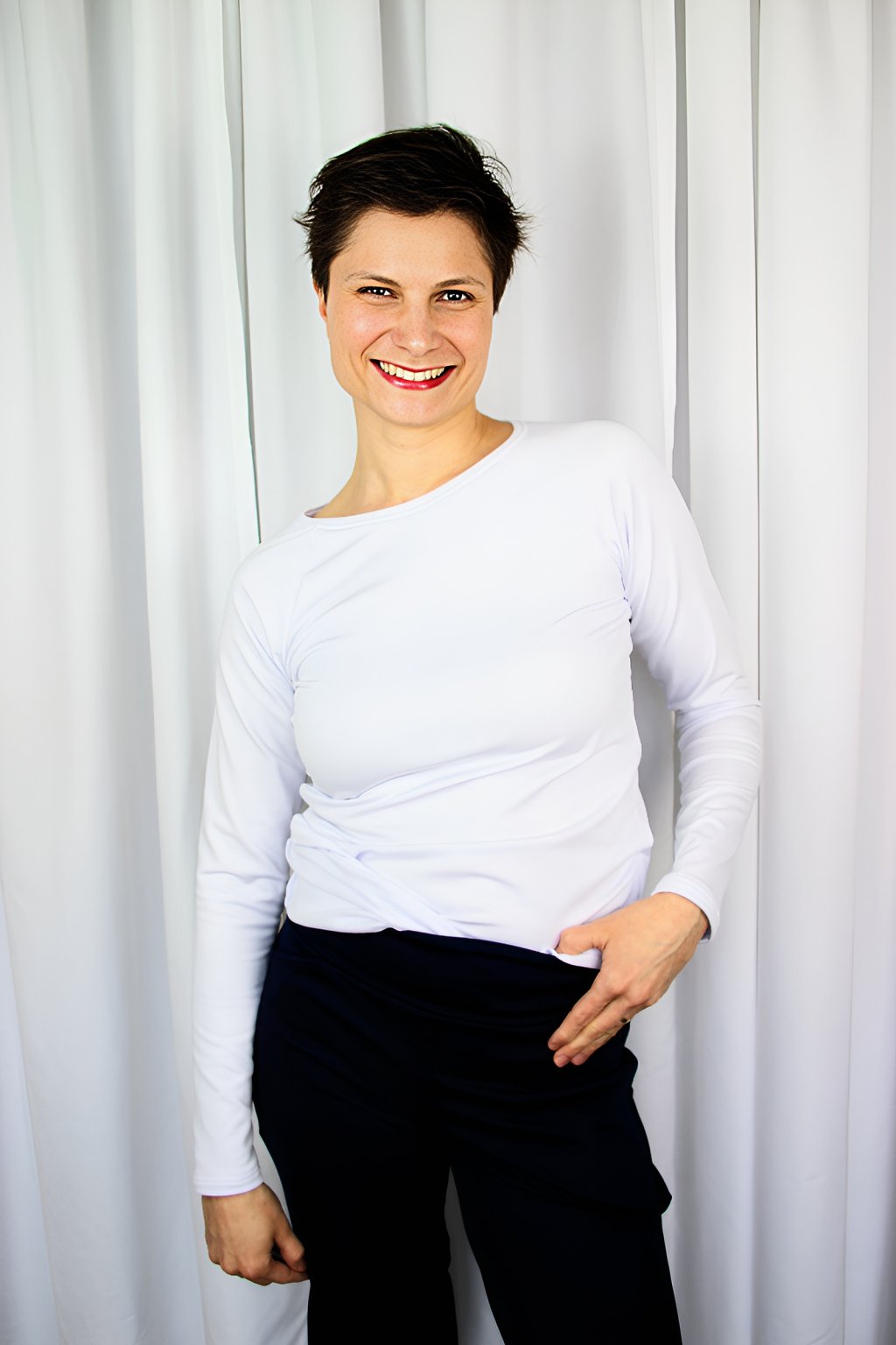Střih je nadčasový a univerzální – sedne k sukni, kalhotám i pod sako. Tričko drží tvar i po mnoha nošeních a praních.